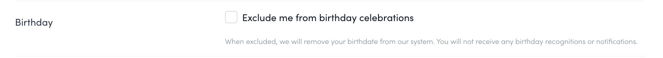Reference this article to find out how to mark your birthday as private. This will exclude you from your birthday being used in the birthday automated program, and won't be visible to any admin or manager in the system.