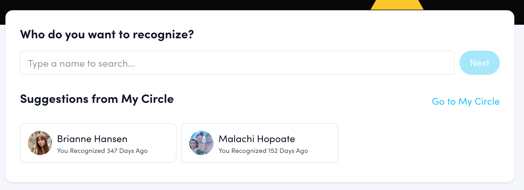 My Circle can either be accessed by clicking on the Profile icon or the “Who Do You Want to Recognize?” widget on the homepage.