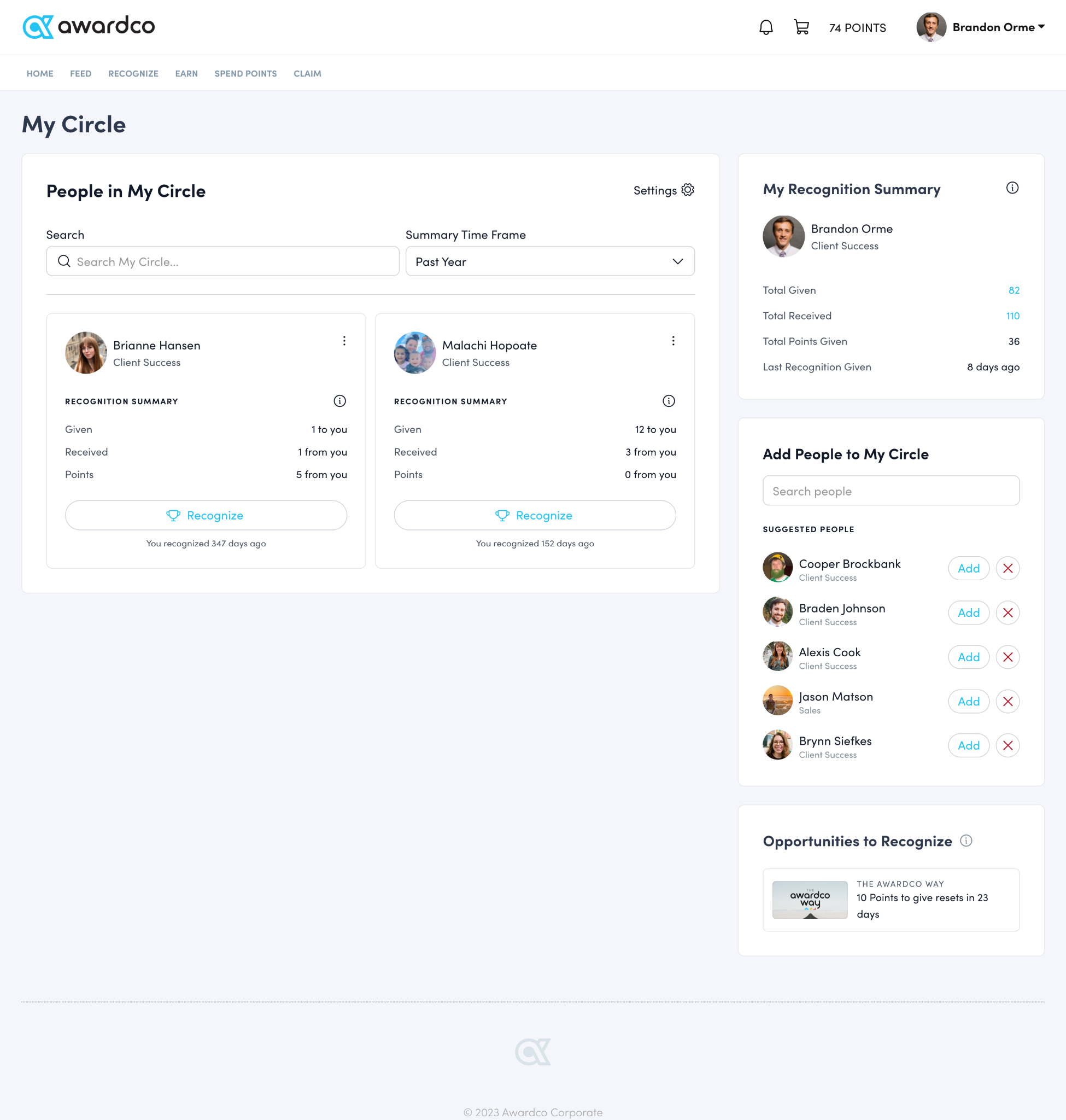 Stay connected with others throughout the company and foster a culture of appreciation like never before with My Circle. My Circle helps you to keep up-to-date with your peers, direct reports, and others throughout the company and encourages a culture of recognition. My Circle suggests people to recognize and highlights when someone hasn't been recognized in a while. Reference the article below for more information how to navigate the feature.