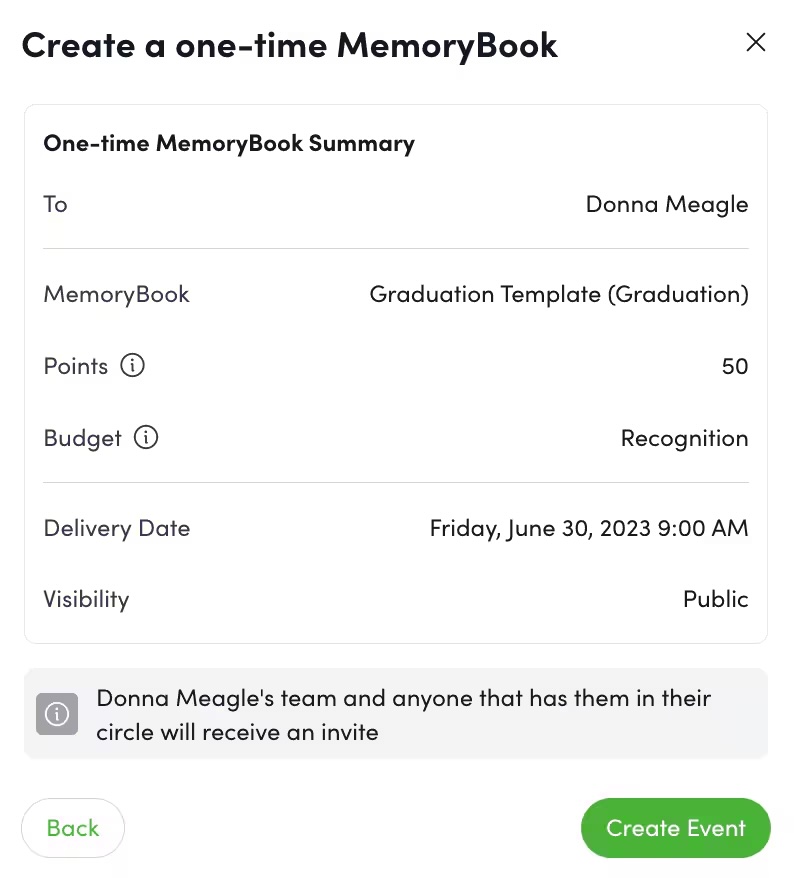 Note: If MemoryBook notifications are disabled, One-off MemoryBooks will not automatically invite team members to comment. Contact your administrator if you need automatic teammate invitations to be enabled.