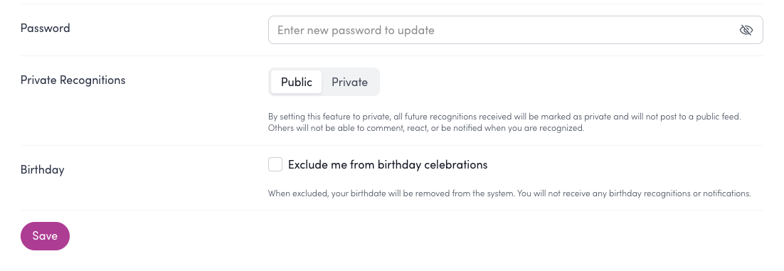 - Scroll down to Private Recognitions Toggle