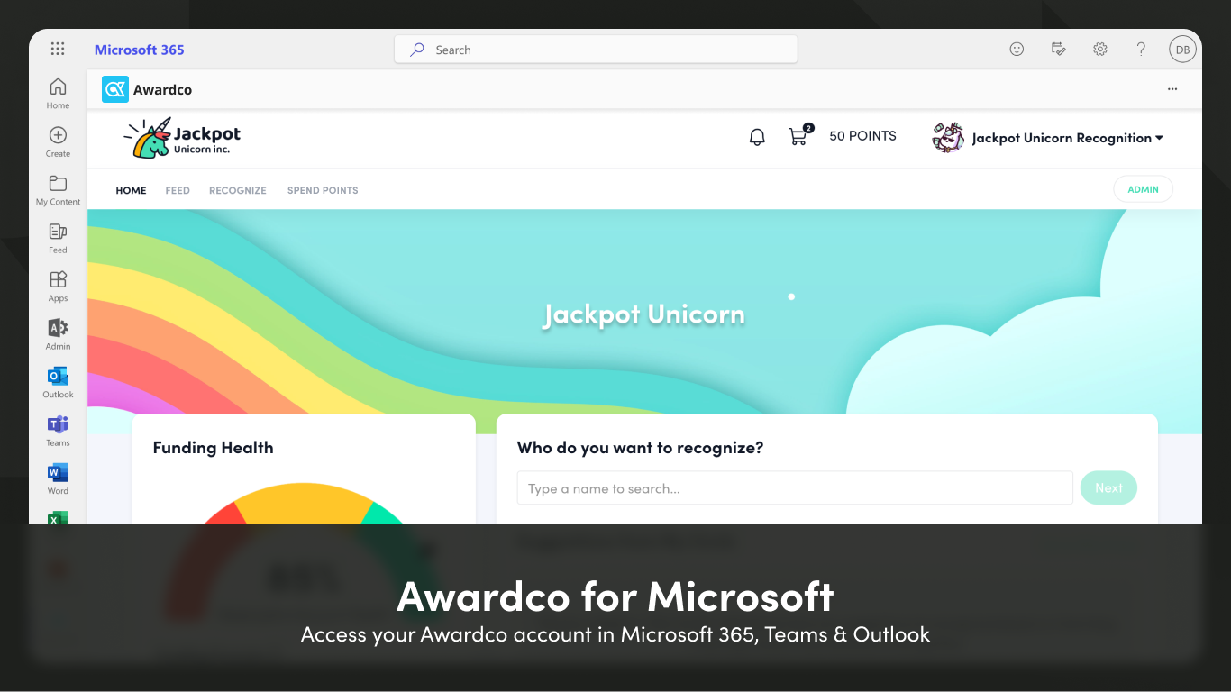 - Full Awardco Access — Users can access the full Awardco platform from within the Microsoft 365 application