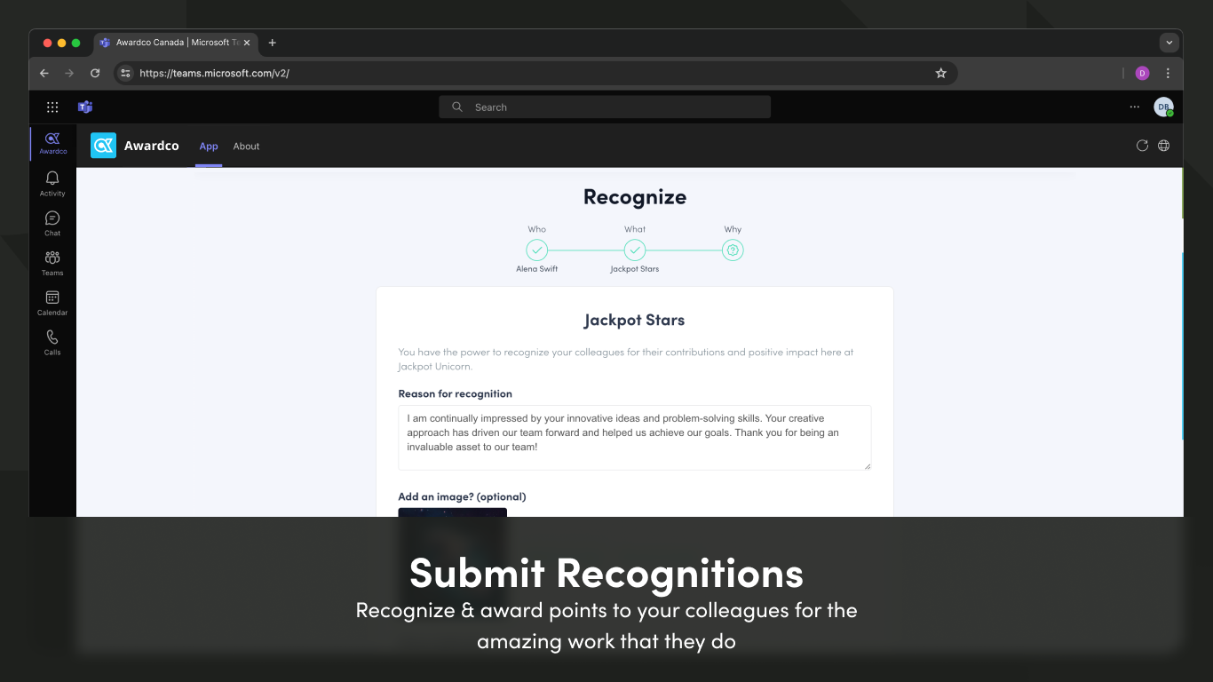 - Full Awardco Access — Users can access the full Awardco platform from within Teams