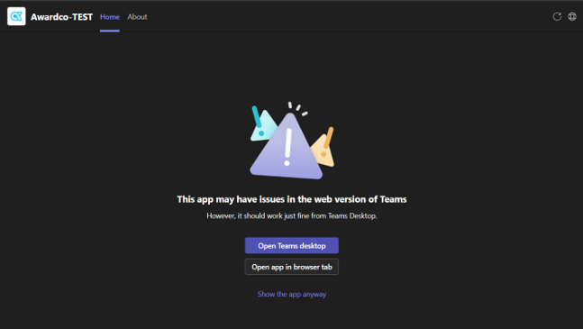 IMPORTANT REGIONAL NOTE: Clients hosted on European (award.co.uk) and Canadian (awardcocanada) servers must use the dedicated "Awardco Europe" or "Awardco Canada" app from AppSource. The European and Canadian app currently offers the embedded experience only and does not support Teams Notifications or the Quick-Recognition Tool.