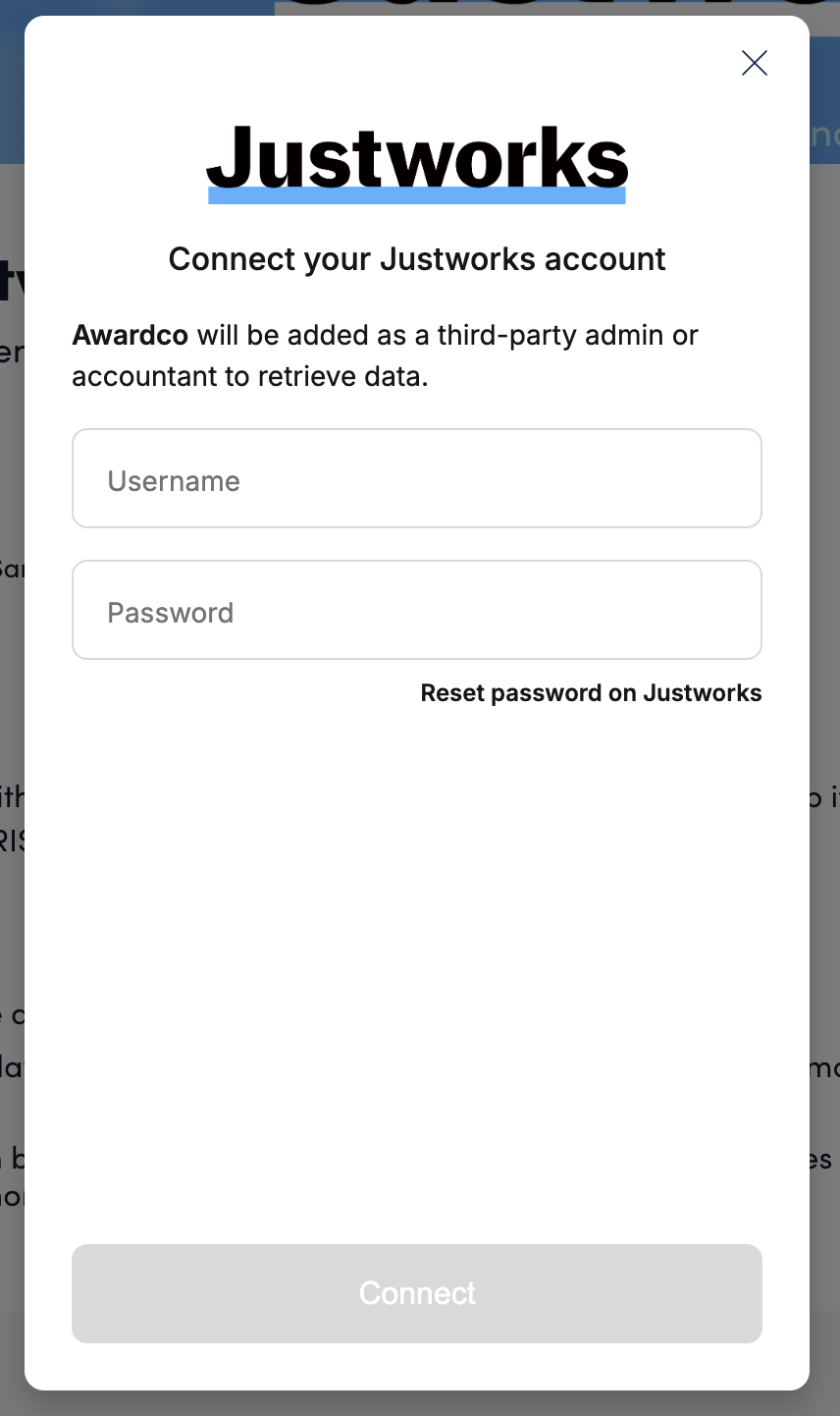 - Connect your Justworks account by inputting your username and password. Click Connect.