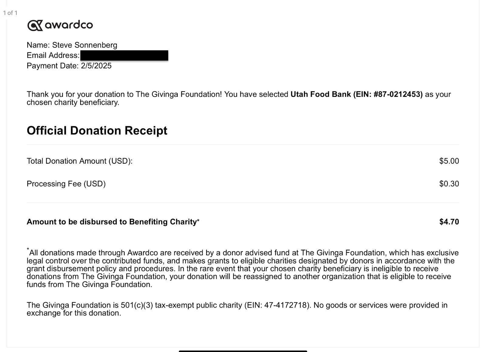 After completing your donation, if allowed, you'll receive a donation receipt via email that includes:
