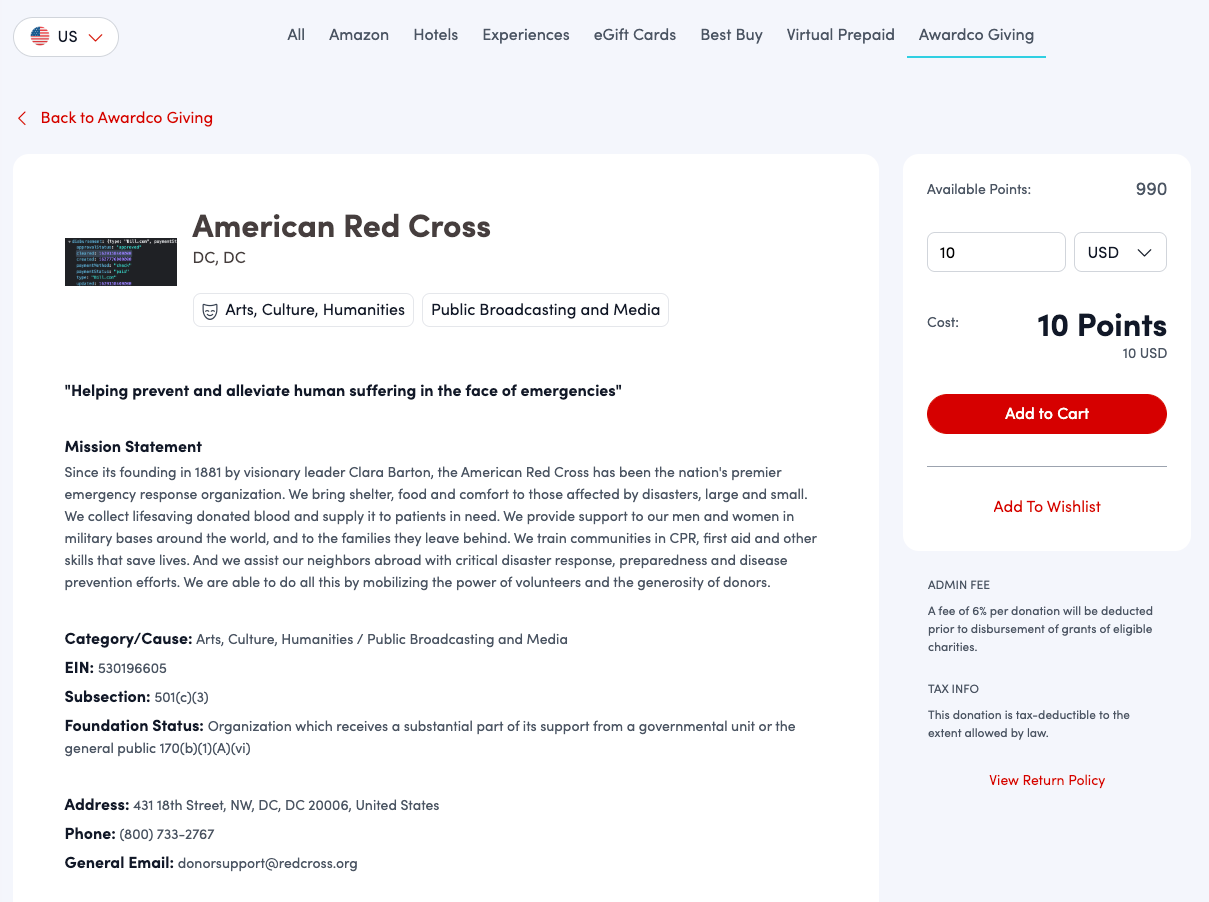 When you choose to donate your points, Awardco converts them to a monetary value that goes directly to your selected charity. All donations are processed in USD, even for international charities, ensuring a streamlined experience regardless of the charity's location.