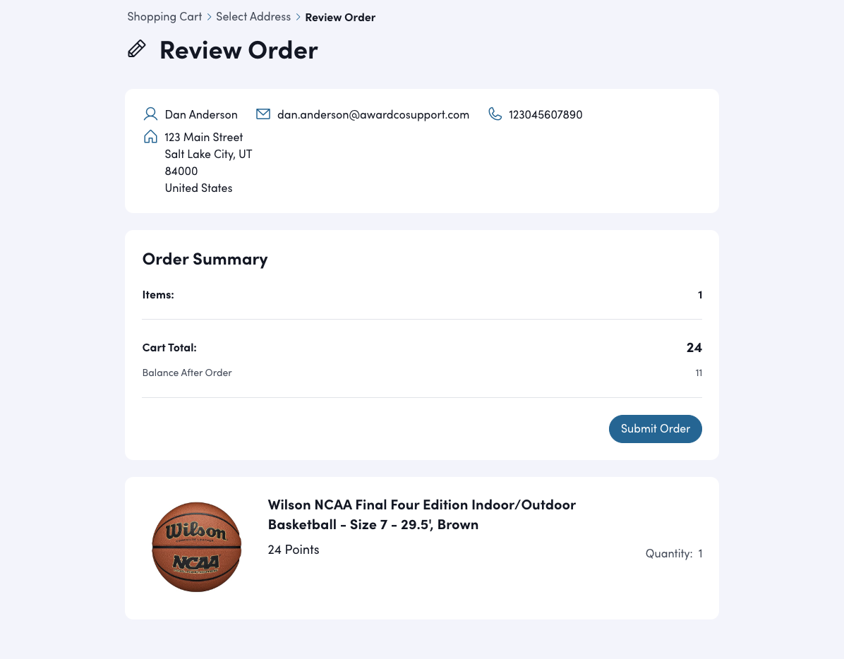 This final page allows you to double-check all the details of your order before it's placed. Confirm that the points, selected items, and shipping address are correct, and then click Submit Order.