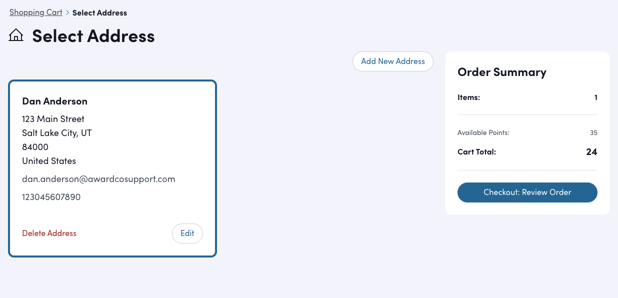If you need to ship multiple orders to different addresses, you'll need to process each order separately, selecting the appropriate shipping address for each before proceeding to checkout. If the displayed shipping information for your current order is correct, select the address and click Checkout: Review Order.