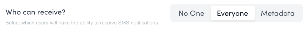 Who Can Receive: Select who can receive SMS notifications: "No One," "Everyone," or "Metadata" (users with specific metadata). Note that this only determines eligibility; users must still opt in.