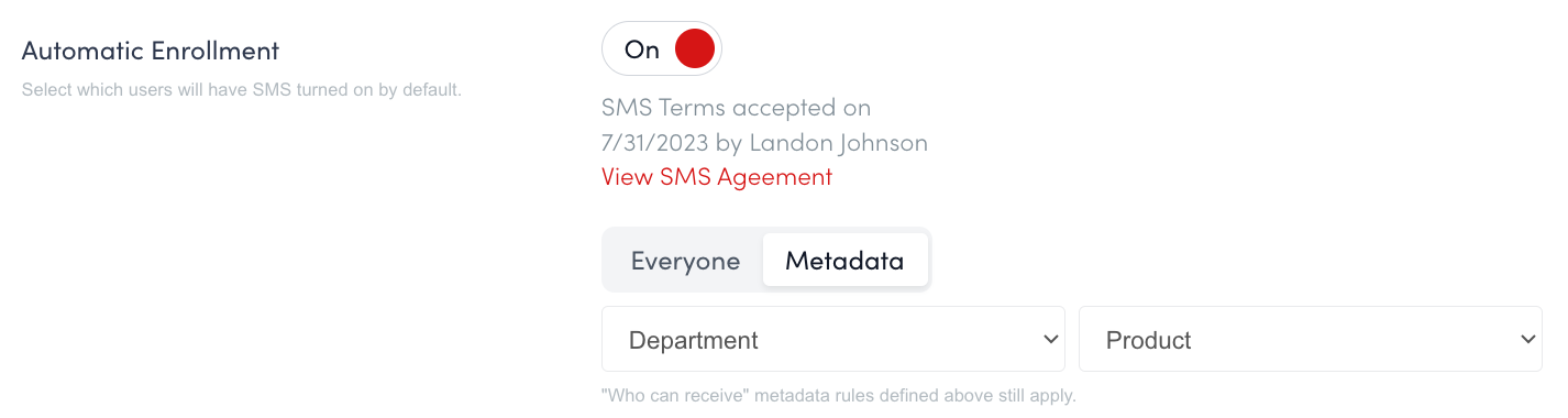 Automatic Enrollment (Optional): Automatically enroll users. Options are "Everyone" or "Metadata." You must accept our SMS Agreement, acknowledging you've obtained employee consent, when enabling this setting.