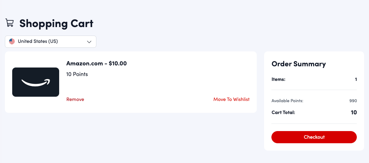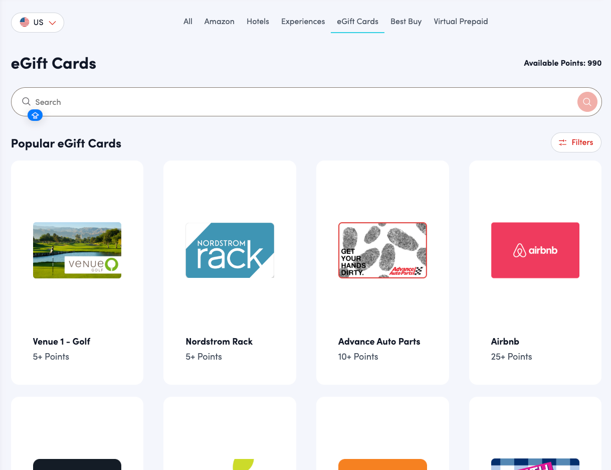 After selecting eGift Cards you will be brought to the eGift Cards landing page where you can select your desired gift card(s). The first section will display a balance of how many points in your wallet you're able to spend on eGift cards. Scrolling down will display all available cards. Narrow down your search by typing in keywords in the search bar to the left. Toggle the switch below to display items you can afford, and apply any filter category to find exactly what you're looking for.