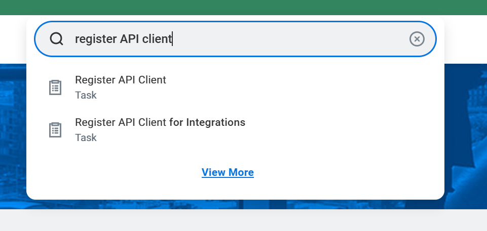 - Run the "Register API Client for Integrations" task in the search bar.