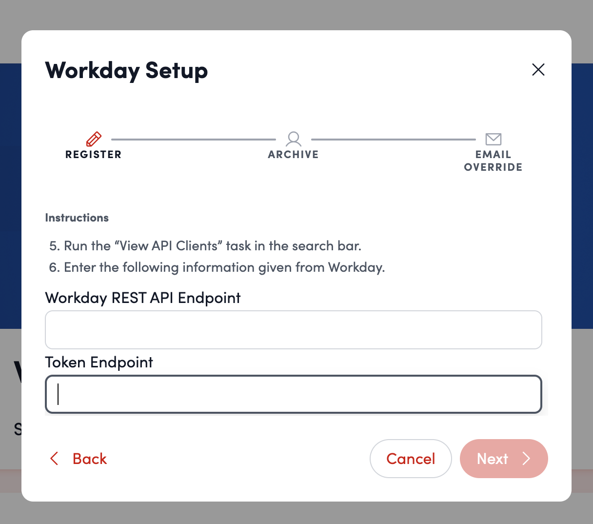 - Input the Workday REST API Endpoint and Token Endpoint. Click “Next.”