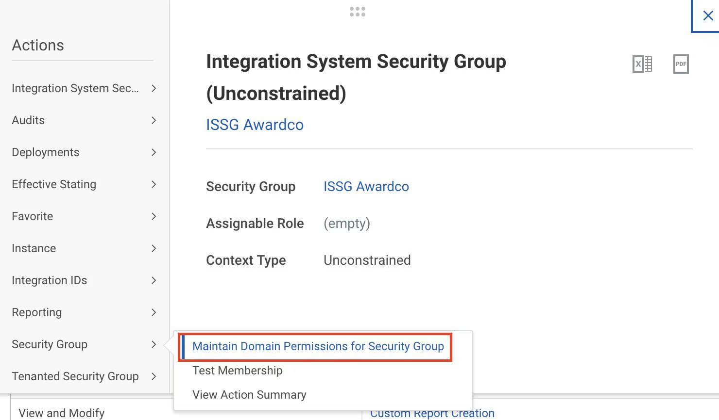 - Go to the security group's "Related Actions" icon, hover over "Security Group," and click "Maintain Domain Permissions for Security Group."
