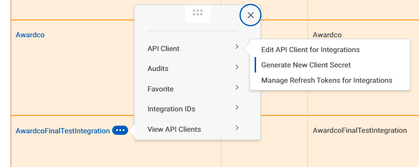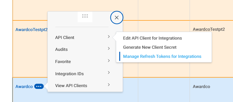 - Hover next to the name and click on the three dot menu (related actions) and select API Client > Manage Refresh Tokens for Integrations