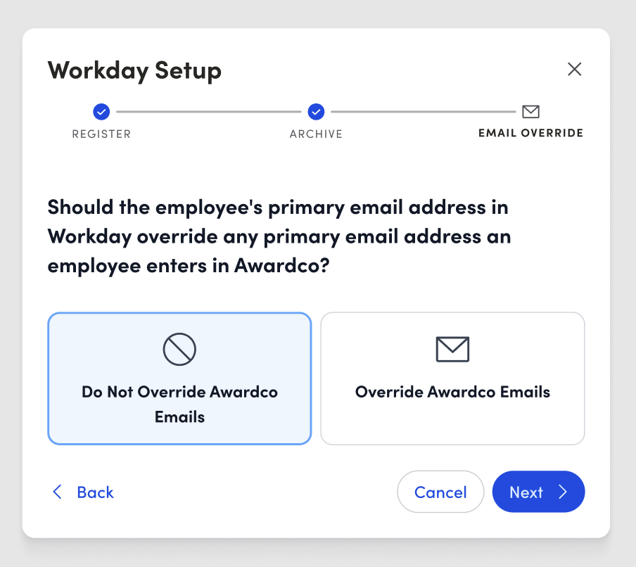 - Override Emails: Overwrite employee email addresses in Awardco with updated data from Workday during each import.