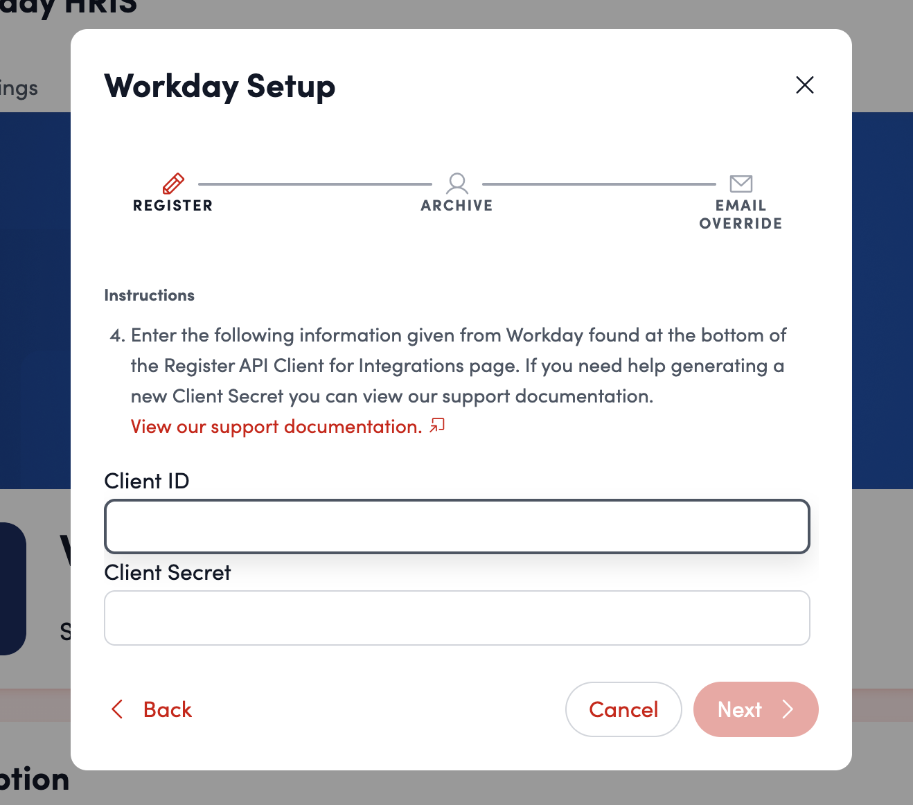 - Input the Client ID and Client Secret in the appropriate fields. This information was given by Workday and is found at the bottom of the Register API Client for Integrations page. Click “Next.”