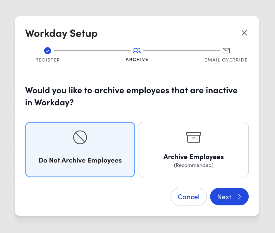 - To have employees listed as “inactive” in Workday archived in Awardco, click the “Archive Employees” option on this page. This is recommended.