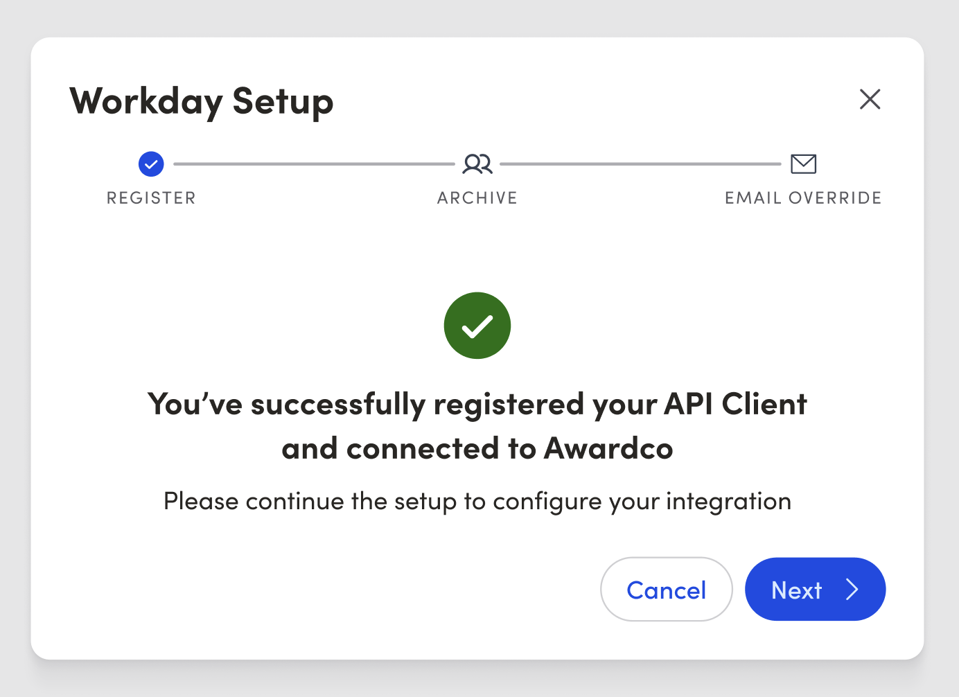 - If you haven’t registered Awardco as an API Client for Integration in Workday, follow the instructions in the “Registering Awardco as an API Client in Workday” section. If you have, click “Next.”