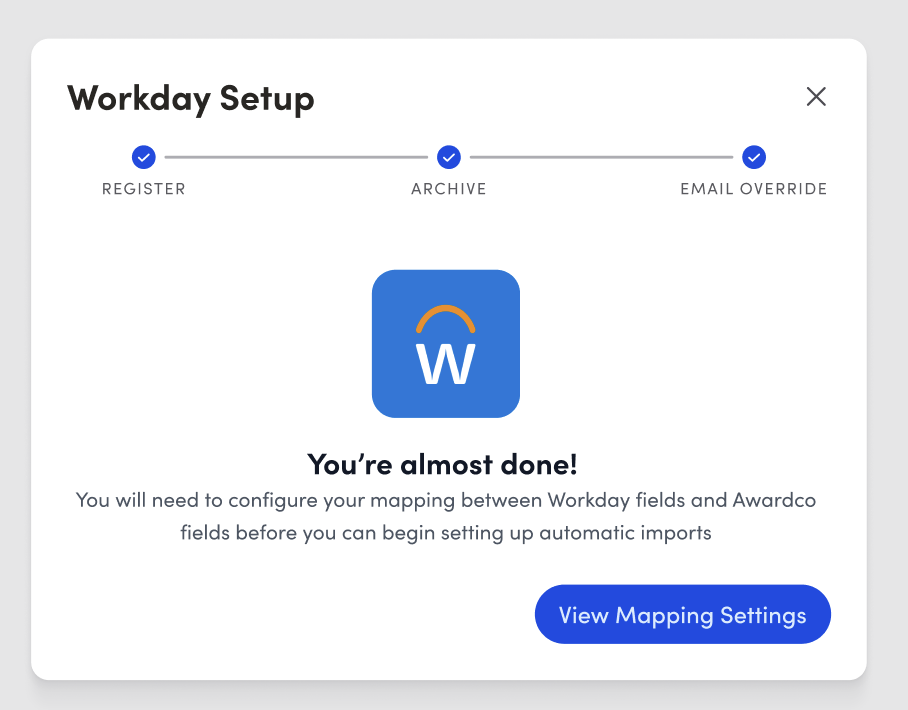 - A: Yes! You can easily return to the Mapping Employee Data Fields or Configuring Import and General Settings sections from the Workday HRIS Integration page in Awardco. These sections are designed for ongoing management and can be accessed at any time after the initial setup.