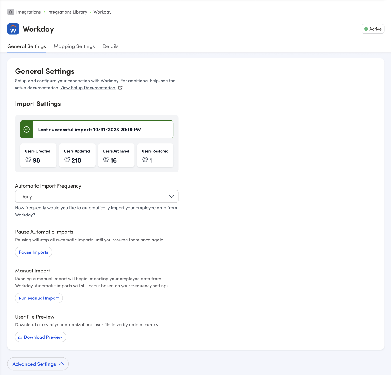 Advanced settings provide more control over how data is imported from Workday.