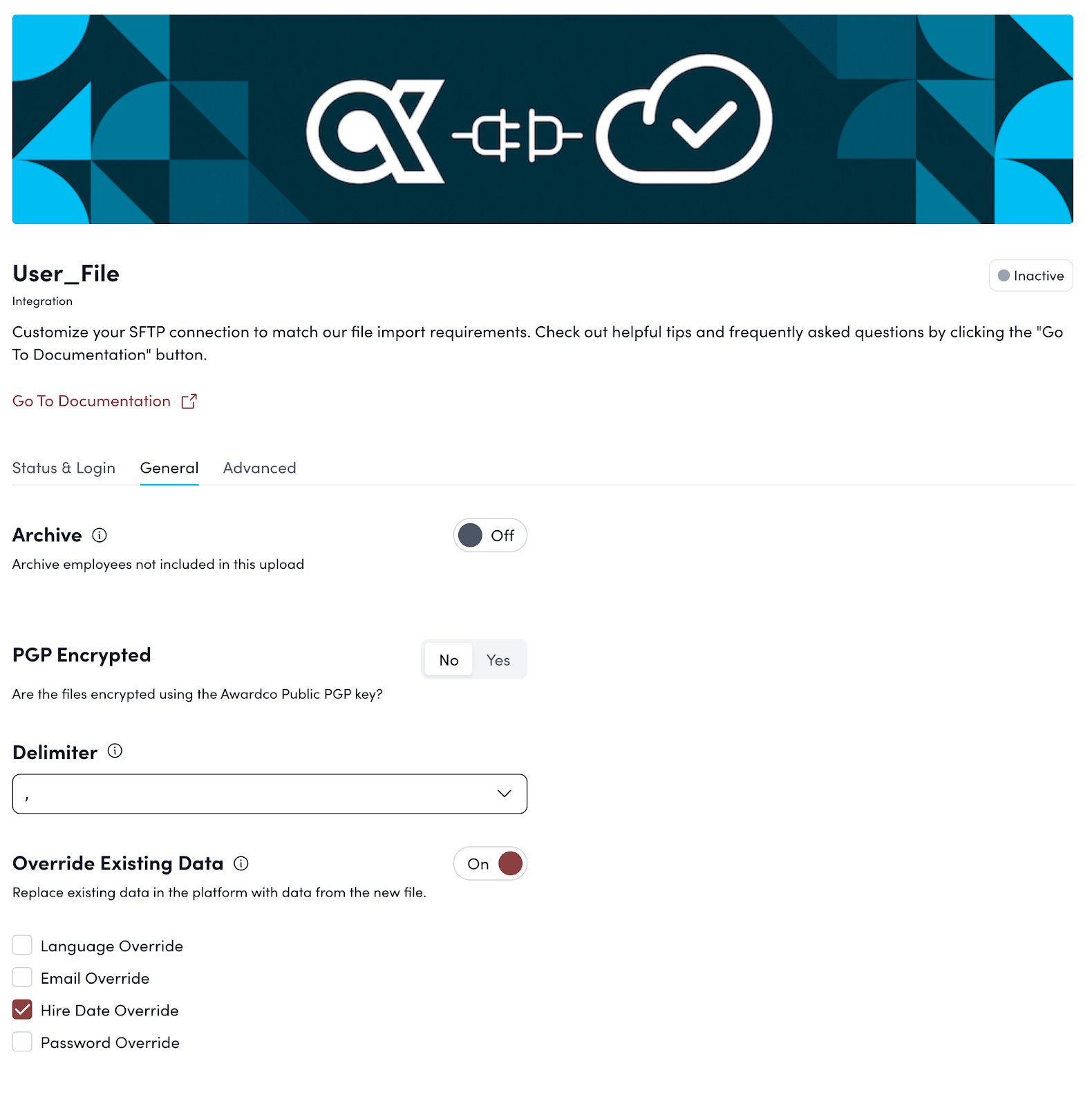 - Make necessary adjustments, such as Archive and Overriding Existing data settings, in the ‘General’ tab in Awardco SFTP settings.