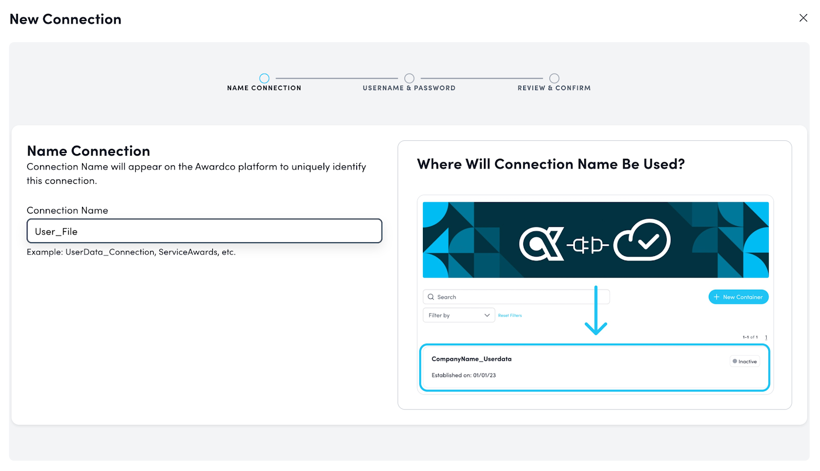 - Name the connection (e.g., "UserData_Connection," "ServiceAwards"). Click "Next."