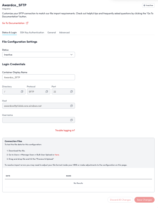 - Note: Find this info in the ‘ Status & Login ' section of Awardco SFTP settings. Consult IT/HRIS experts if needed.