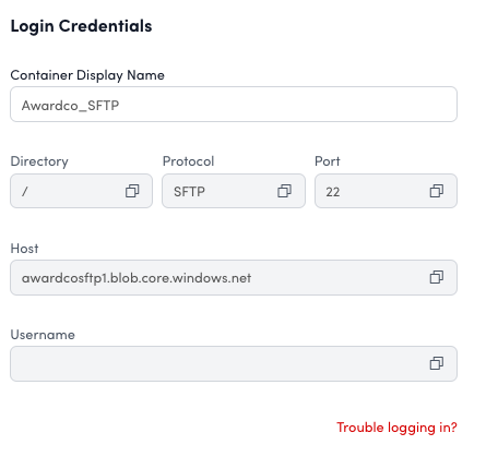 - Select the ‘Trouble logging in?’ link in the ‘Setup & Login’ tab in Awardco SFTP settings.