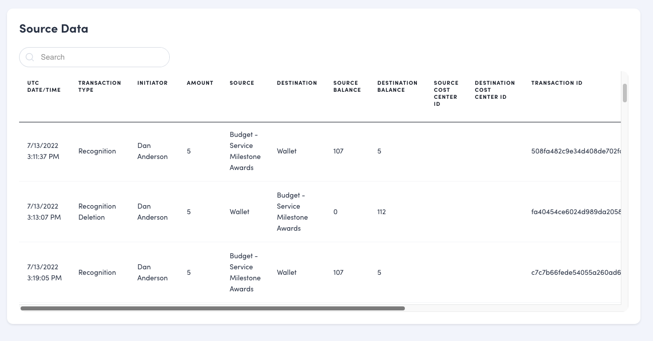 | SOURCE* | Budget - Birthdays | Where the points came from. For wallets, the format is "Wallet - [First Name] [Last Name]". For budgets, it is "Budget - [Account Name]". If the source is external, it is labeled "External." |
