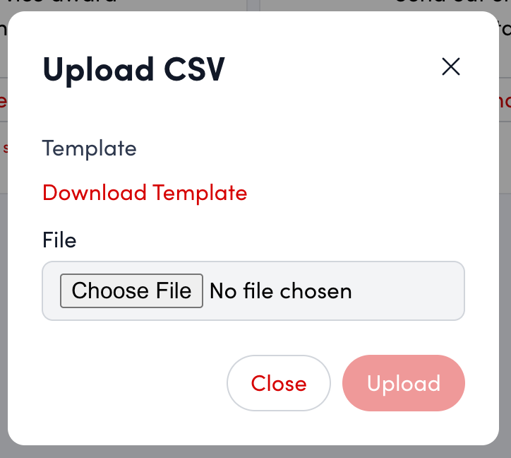 To send bulk recognitions via a CSV, click Download Template. Follow the instructions in the Building a CSV File for Bulk Recognition article to help you in filling out the template. Once finished, click Upload CSV, select your file, and click Upload. The pending award(s) will appear in the Pending Tab in Queues.