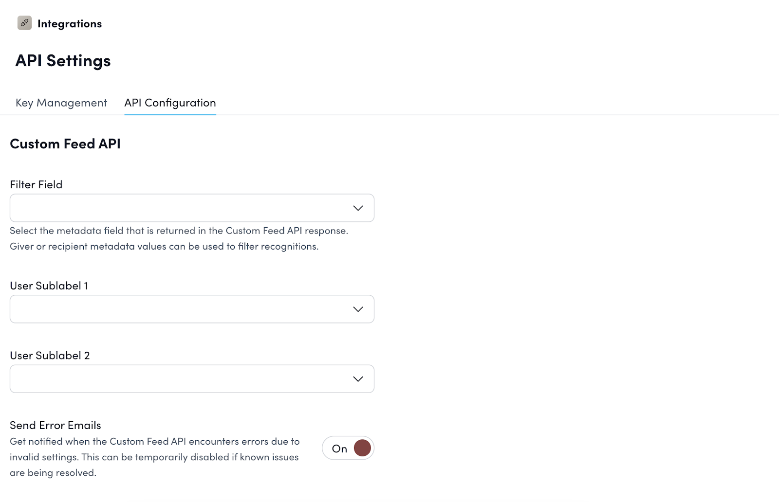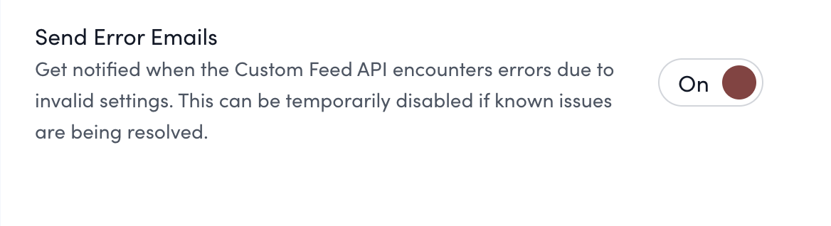 To ensure your setup runs smoothly, we recommend enabling Error Emails. This feature will notify you if there are any issues with the Custom Feed, such as invalid configurations or missing metadata.