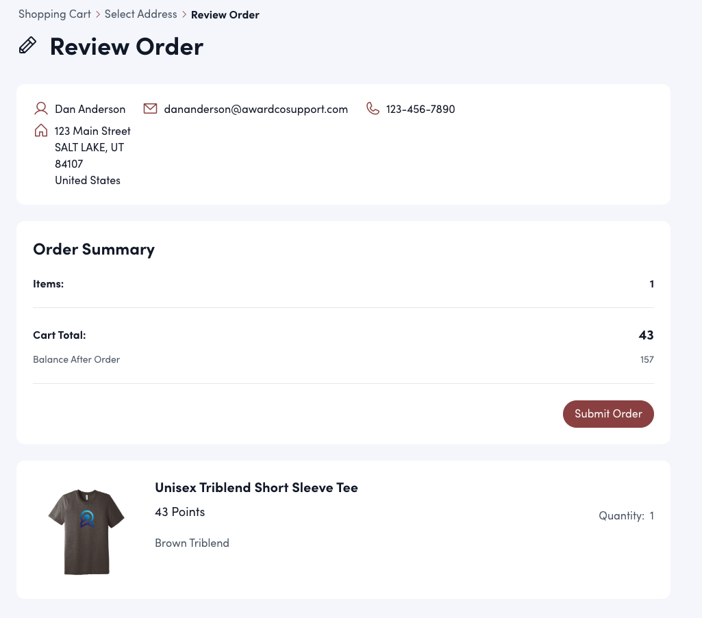 This will take you to the final review page before you place your order. Confirm that the points, items, and shipping address are all correct, and then click Place Order.