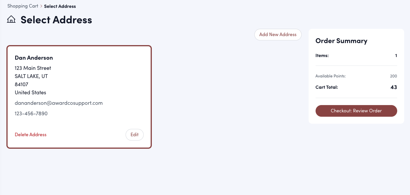 Choose the desired shipping address for your current order. If the information is correct, proceed with “Checkout: Review Order.”