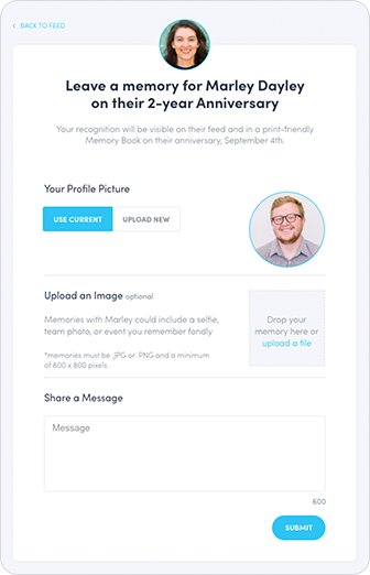 1) Each user will have the option to upload a new profile picture, to use their current picture, or to elect to not add a picture to their recognition they leave as part of the MemoryBook. If there is no picture loaded and they choose to submit the comment with no photo, no avatar or profile picture will be shown in the MemoryBook for the giver of the recognition.