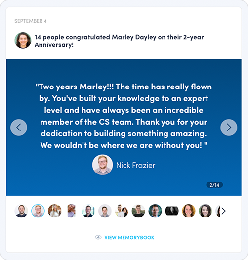 The recipient's individual MemoryBook will be accessible by clicking the "VIEW MEMORYBOOK" button at the bottom of their post. MemoryBooks will pull the teammate comments into a custom digital experience that celebrates the recipient's anniversary. Users have the ability to export their MemoryBook as a PDF to keep a digital file of the experience.