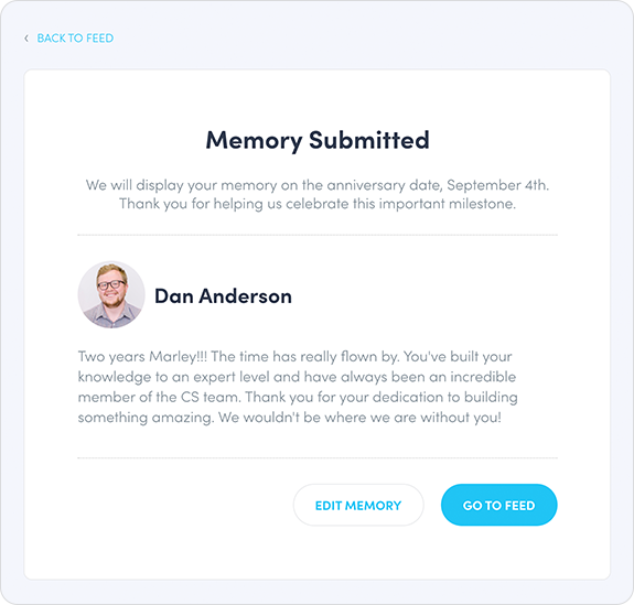 On the recipient’s anniversary they will log into their account and see a post in their feed congratulating them for their service and displaying the comments and any pictures submitted by their peers.