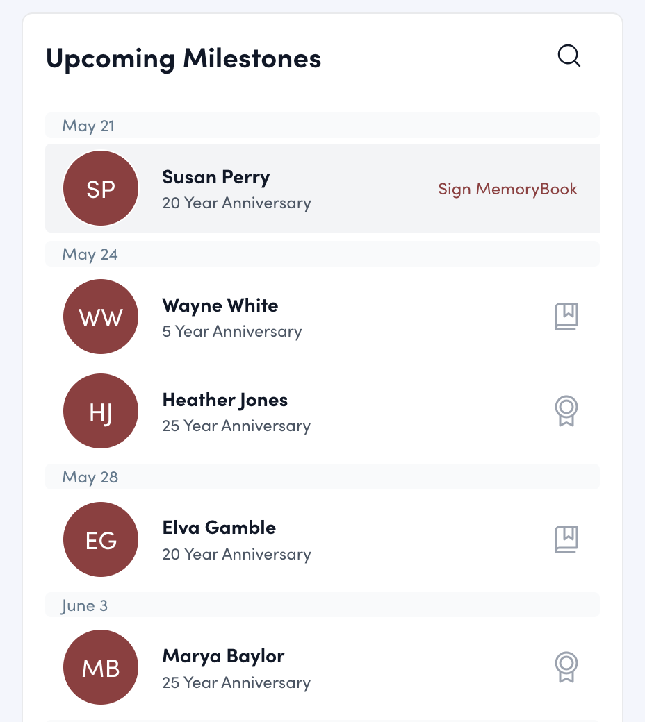 If the Upcoming Milestones widget is accessible to you on the homepage or Feed tab, simply hover over the book icon positioned to the right of the user's name to sign their MemoryBook.