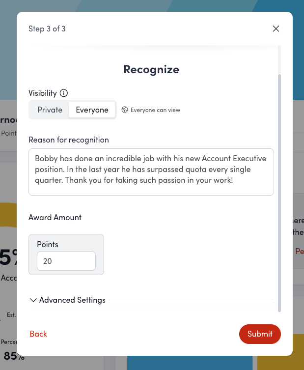 After selecting the program, complete the recognition form. This form is highly customizable and may include multiple-choice questions, accompanying images, short answer text boxes, platform tags, monetary amounts, and more. In the example below, Dan will provide a reason for the recognition, attach a value tag, select an award amount, specify whether the recognition will be visible to everyone or only the recipient, and then click "Recognize." Once you submit the recognition, it will either be processed immediately or routed to an approval queue, depending on your platform's configuration.