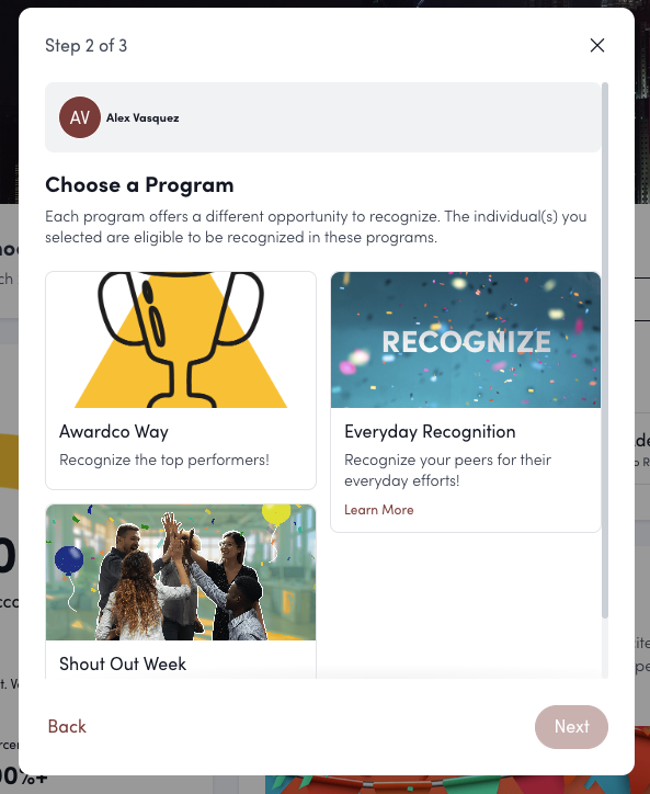 The recognition programs feature enables your organization to operate multiple recognition programs on a single platform. The settings for these different programs, including eligibility criteria, were established during implementation or in collaboration with your Client Success Manager. For any questions regarding this program type, please reach out to your current Awardco point of contact.