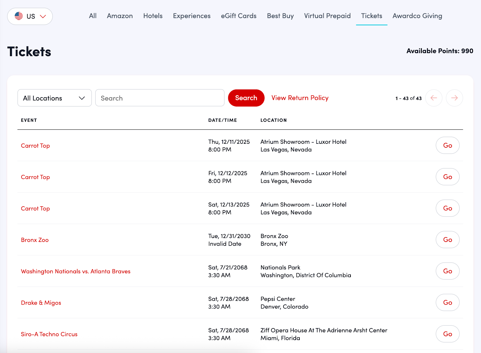 Available tickets will be listed by price in points, from lowest to highest. Click “Go” next to the tickets you wish to purchase.