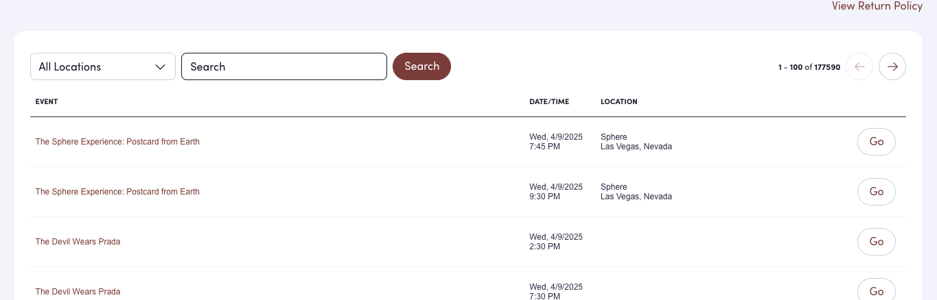 A list of available ticket options will appear. Please note that the events shown are examples to illustrate the types of ticketed events that may be available. You can refine your search by selecting a specific location from the Locations dropdown menu. If you already know the event you'd like to attend, type the name of the event into the Search Bar and click “Search.”
