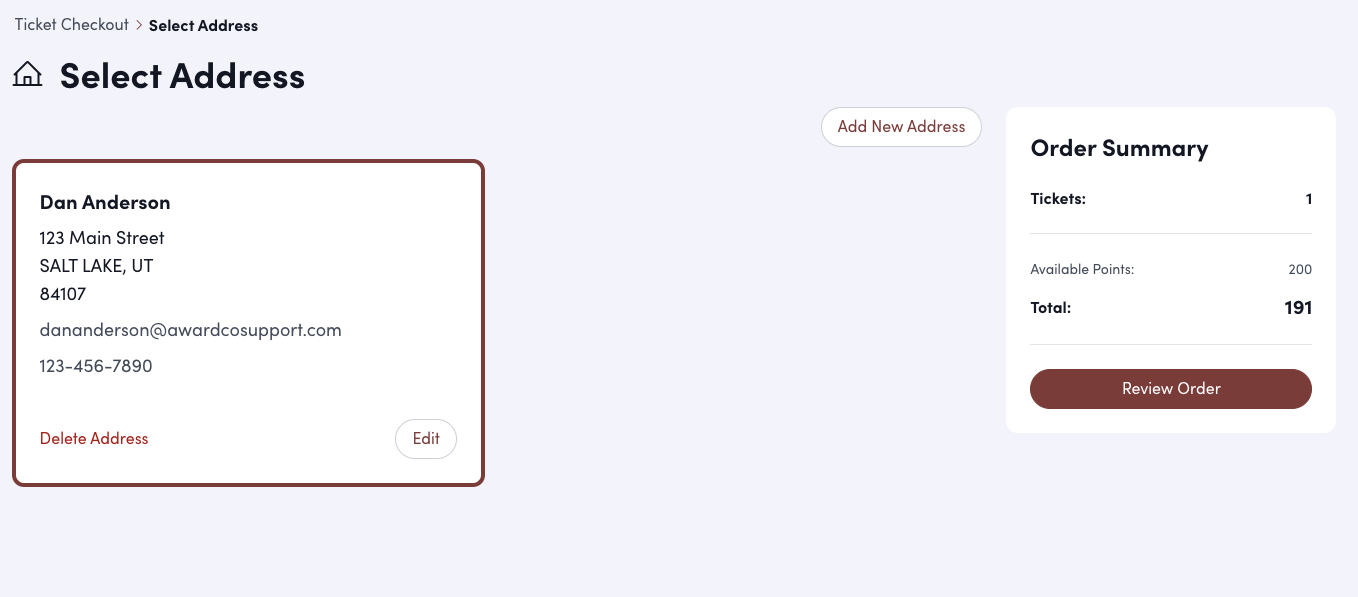 On the following screen, you will choose the address where you want your tickets to be shipped. If the information is correct, click “Select.” (If you have placed orders from your account previously, you will be automatically directed to this page, bypassing the address form.) Click “Review Order” to proceed.