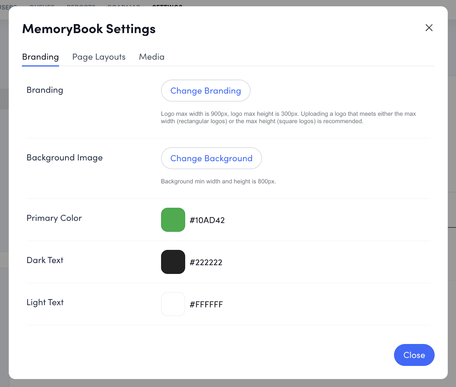 To begin with step one, click "Settings" to access the configuration page. While the system will automatically incorporate your general platform branding and create a custom background based on the colors defined in your branding tab, you have the option to choose alternative branding colors, a logo that will appear only in the MemoryBook, and upload a custom background image.