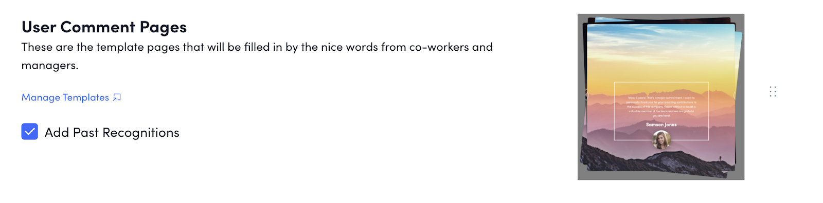 Next on this page is the Memory Templates section. Here, you can individually select the template types that will be displayed within the MemoryBook experience. These templates are used by the system to integrate the comments and images uploaded by the recipient's teammates into the digital experience. Some template types are text-only, while others support images. On this page, you can also upload custom background images for the templates. This will help you establish a consistent theme across your MemoryBooks and tailor the look and feel of the experience to your specific organization.