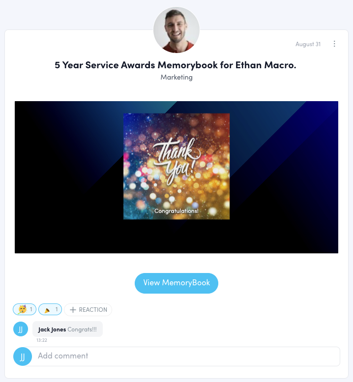 On their anniversary, when the celebrating employee logs into their account, they will see a post in their feed congratulating them for their service and displaying the comments submitted by their colleagues. The employee can view the full content by clicking "View MemoryBook".