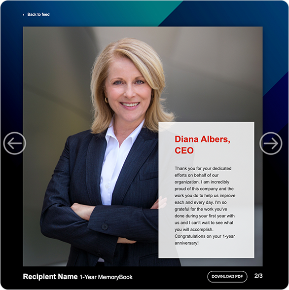 MemoryBooks compiles the teammate comments into a personalized digital experience that celebrates the award recipient's anniversary. As part of MemoryBooks, you can design standard pages to be included in each employee's individual MemoryBook. These standard pages could feature messages from organizational leadership, company values, the history of your organization, and more. The screenshots below illustrate a sample title card, a sample congratulatory message from the CEO, and a sample comment from a teammate. Each of these pages is customizable and can be tailored to match your organization's branding, emphasize company values, and highlight your program goals. Users also have the option to export their MemoryBook as a PDF.