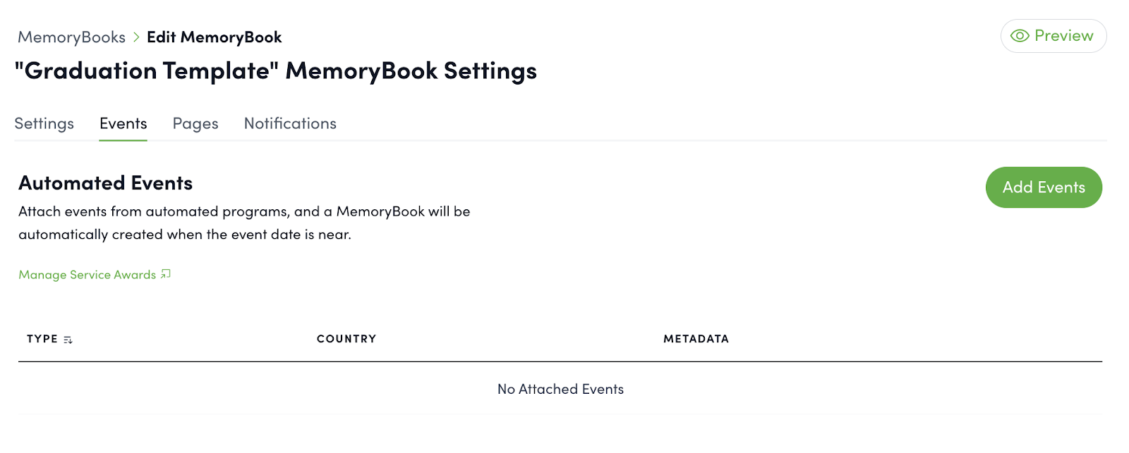 Next, review the settings on the Events tab. If the MemoryBook is associated with service awards, attach the relevant events here. The service award automation rules will override any award settings shown in the previous section. If the MemoryBook is for one-off celebrations, leave this page blank.
