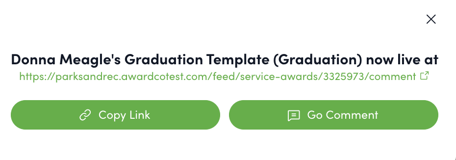 After submitting their comment, the user will be taken to a confirmation page. On this page, they can preview their comment, return to the form to make edits, and invite others to participate in the anniversary celebration. This "Invite Others" function can be disabled in the settings, but we recommend enabling it so that workplace friends who may not be on the recipient's direct team can also comment and participate in the anniversary celebration. From this page, the teammate who submitted the comment can navigate away from the submission confirmation page by clicking "Back to Feed" or by using the tabs at the top of the page.